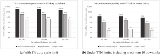 We take 1% as the duty cycle limit, which is applied in various global regions, including the AS923 region that is most relevant to the authors. To consider fair access policies, we use the things network (TTN), which limits airtime to 30 s per device per day and a maximum of ten downlinks. Figure 8 shows the results of applying these constraints to our selected payload sizes, data rates and transmission schemes.