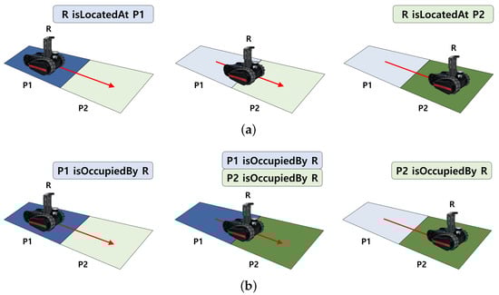 First, the “isOccupiedBy” property represents a place that is occupied by the robot’s movement and contains Place as the domain and Robot as the range. This object property is created for the robot’s starting and destination places. The difference between this property and the “isLocatedAt” property, which represents the robot’s location, is when it becomes active/inactive, as shown in Figure 1a. By defining the “isOccupiedBy” property, we can determine where the robot is working and utilize this knowledge to manage the robot’s traffic. The “isNotOccupiedBy” property is defined to represent the negation of the “isOccupiedBy” property, which is created as opposed to the active/inactive of the “isOccupiedBy” property. Second, the “isUsedBy” property with the object is defined to represent the robot’s possession knowledge. This property contains Object as the domain and Robot as the range and is used to avoid the redundant use of objects when planning tasks for the multi-robot. To represent the negation of this property, we define the “isNotUsedBy” property. In addition, the “canUse” property is defined to express whether a specific object can be used and is used as a constraint when planning multi-robot works. Finally, the “isDifferent” property is defined to describe the relationship between different robots and is used to ensure that all robots are considered in the detailed planning.