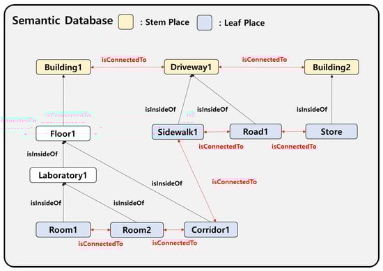 This expression retrieves the top-level Place environmental element by comparing the places in the semantic database that are involved in the “isInsideOf” property with the group corresponding to the domain and the group corresponding to the range. As shown in Figure 2, we can utilize this expression to query Building1, which includes rooms, a corridor, and a floor in the “isInsideOf” property.
