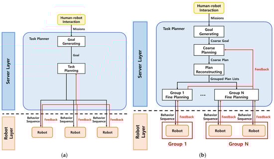 Comparison of semantic knowledge-based task planning structures for multi-robot. (a) Presented hierarchical task planning approach in []. (b) Proposed hierarchical task planning approach.