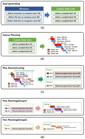 Four steps of the proposed hierarchical task planning approach. (a) Goal-generating step, which generates coarse goal lists with given missions. (b) Coarse planning step, which creates coarse plan lists utilizing all robots with coarse goal lists. (c) Plan reconstructing step, which groups overlapping robots in the coarse plan lists. (d) Fine planning step, which creates detailed behavior sequences for each group of robots.