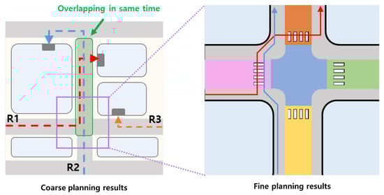 Finally, the fine planning step plans the corresponding tasks per group using the POPF planner based on the fine-level tasks. For planning, each group’s goal reconfigures the Place parameter to the leaf place, such as “delivery_complete Box1 room103.” The idea of this step is to organize the on-demand database by querying only the information of the stem places where the tasks are performed. So, we only query the leaf places that are included as the “inInsideOf” property to the stem places used in the coarse plan result generated for each group. Then, as shown in Figure 5d, the task planner generates a fine-level task sequence to accomplish the assigned task for each group. This generates a detailed task plan based on leaf places, such as a sidewalk, and a crosswalk, as shown in Figure 6.