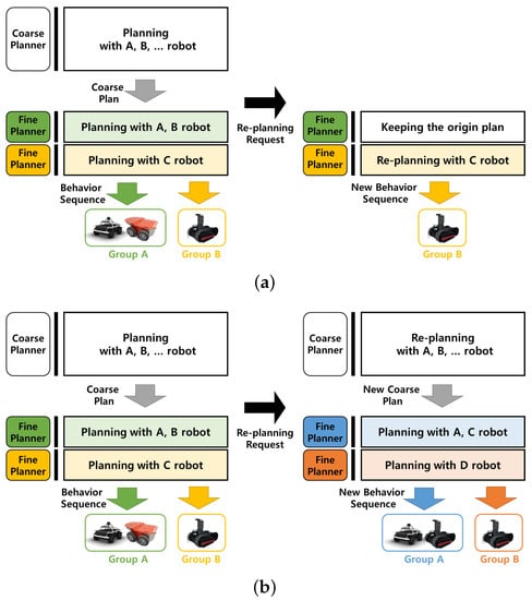 Re-planning method in the proposed approach. (a) Case of specific robot group re-planning. (b) Case of all robot re-planning.
