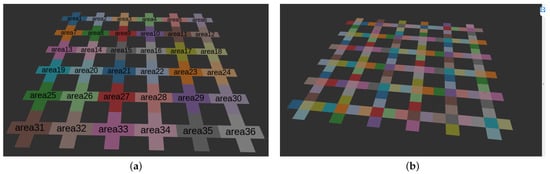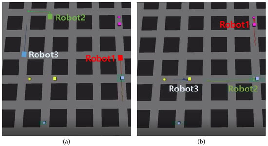 Figure 16 is an example of a task plan with three robots generated using the previous and proposed methods. As shown in Figure 16a, each robot moves at the same time from the assigned corridor to deliver the items allocated to each robot. After navigating to the place where each item is located and waiting for a period of time, the robot moves to the target place. Thus, as shown in Figure 16b, the robot’s mission ends when each robot has completed its assigned task.