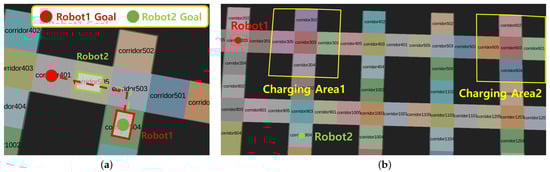 Two situations were considered to demonstrate what differences the extended semantic knowledge for multiple robots make to task planning, as shown in Figure 10. First, we compared the generated plans based on the proposed occupancy knowledge by implementing a situation where the robots cross each other. For comparison, a scenario was constructed where the target places of the robots intersected, as shown in Figure 10a. The generated sequence of tasks was compared to reach the destination and the plan execution results. Second, we compared the generated plans based on the proposed possession knowledge by implementing a situation where several robots use the charging station. For comparison, the environment was constructed with two robots and two charging areas, as shown in Figure 10b. The generated task plans were compared when short and long charging times were required in this environment.