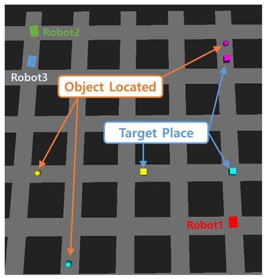 Figure 11 shows an example of three robots delivering three items. The circle shapes are the locations of the items, and the squares are the delivery locations. In this case, different colors were used for the Object location and the target place of each Object in the environment to make it easier to understand the tasks. In the simulation, we assumed that the PickUp task is completed after a while when the robot arrives at the Object location, and the DropOff task is completed after a while when the robot reaches the delivery location.