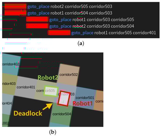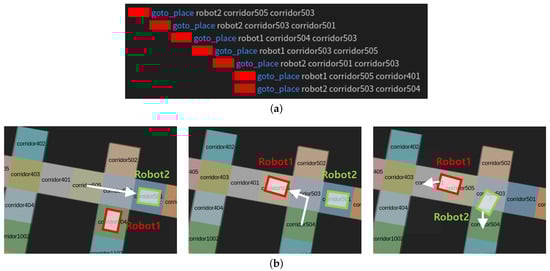 Figure 12a shows the planned task sequence without the occupancy knowledge in a multi-robot cross-driving situation. The planner without semantic knowledge generated parallel robot tasks with the shortest execution time for each robot to complete its goal. However, it did not consider the positions of other robots, so when the plan was executed the robots got into a deadlock with each other, as shown in Figure 12b.