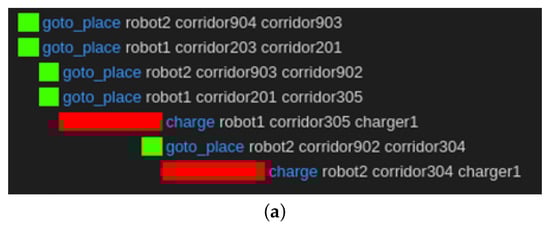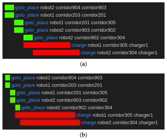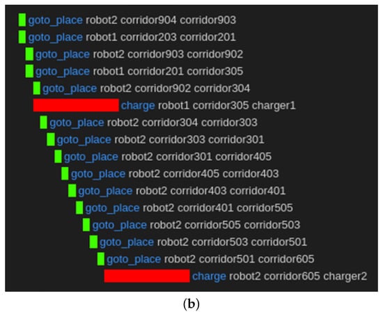 In the case of the charging task, the result of the task planning without the semantic knowledge of “usage” is shown in Figure 14. In the previous method, when a short time is required for charging, the task sequence was planned for each robot to navigate to the nearest charging station and charge, as shown in Figure 14a. This plan did not consider that the other robots had finished charging. Therefore, the late robots waited when this plan was executed at the charging station. If a longer time is required for charging, the task sequence for charging is planned similarly, as shown in Figure 14b.