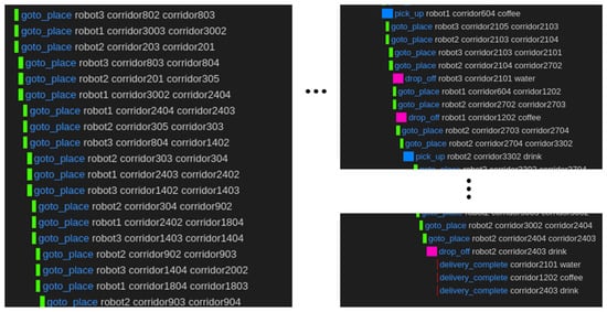 Two actions are defined to represent movement in the coarse-level tasks. This is to identify and group dependencies between robots that work in parallel in the multi-robot system. Therefore, we add a time element to the movement task to determine which robots are in the same place at the same time. For this purpose, move actions are implemented as “duration-actions” in the PDDL, as described in Listings 2 and 3. The time taken for both move actions is calculated as the distance divided by the speed, as shown in the 3rd line of each listing, and expressed as a duration item. This defined action implements an action at the coarse level that operates on a stem place by checking the “isStemPlace” property of the place as a condition to be executed.