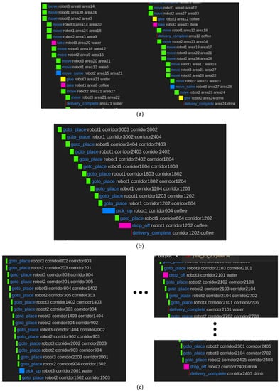 When planning a multi-robot task, the previous task planner used all three robots to generate a task plan, as shown in Figure 17. However, the proposed task planner generates a task plan differently than before, as shown in Figure 18. Our task planner generates a coarse task plan based on the coarse-level hierarchy tasks that work in the stem place, as shown in Figure 18a. Then, the planner generated a fine plan for each robot group based on the generated coarse plan, as shown in Figure 18b,c. Both methods have the same object and destination delivered by the robots in the plan. However, there were differences in the methods used to generate those plans. The table below compares the number of place instances used in each method and the time to plan the task.