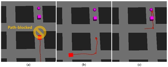 Figure 21 shows an example of semantic knowledge-based multi-robot re-planning. As shown in Figure 21a, when the robot fails to execute a task due to external factors, the robot updates the current situation to the server and generates a plan to execute the remaining mission. In this case, the task planner re-plans and executes a path that avoids the blocked area, as shown in Figure 21b. This finally generates a plan to reach the goal, achieving the mission, as shown in Figure 21c.