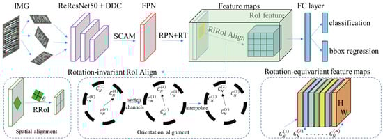 The overall architecture of the proposed method. ReResNet-50 is adopted as the backbone network to extract rotation-equivariant features and the conventional convolution operation is replaced with the proposed DDC. Under the cyclic group , the rotation-equivariant feature maps with the size have orientation channels, and each orientation channel corresponds to an element in . SCAM is proposed to enhance the representative capability of high layer semantic features. Finally, RPN and RT are adopted to generate RRoI, followed by a RiRoI Align to realize RoI-wise classification and bounding box regression.