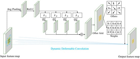 As illustrated in Figure 3, input feature maps are fed into a set of average pooling, convolutional layers and Rectified Linear Units (ReLU) to obtain the weight . Compared with DCN, a weighted conventional convolution layer branch is added that dynamically adjusts the offset weights of convolution kernels by obtaining the weights of convolution kernels and increasing the offset direction. The specific calculation method of offset weights is as follows: