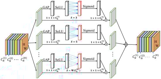 SCAM is proposed to further improve the representative capability of semantic features; its network structure is shown in Figure 4. SCAM aims to enhance the feature channels important in the object detection tasks while suppressing the irrelevant ones. SCAM uses Scaled exponential Linear Units (SeLU) [42] and Global Average Pooling (GAP); these can avoid possible gradient explosion. To avoid high complexity, SCAM only considers direct interaction between each channel and its S-nearest neighbors. Meanwhile, one-dimensional convolutional kernel size is adaptively selected.