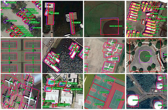 In order to show the effectiveness of the proposed method more intuitively, the visualized detection results on the DOTA-v1.0 dataset are depicted in Figure 5. It can be clearly observed that the proposed method achieves accurate bounding box regression in detecting densely packed and arbitrary oriented objects, and that it can capture the edge information of the rotated objects better and obtain a higher detection accuracy.