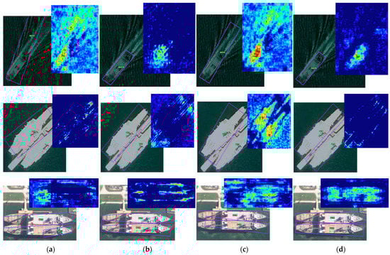 Additionally, in order to compare the effect of the different components more intuitively, the visualized detection results and feature maps on HRSC2016 dataset are depicted in Figure 6. It can be clearly observed that, when compared with the baseline, SCAM allows the network to enhance the feature channels important to the detection tasks, and that DDC can capture the edge information of the rotated objects better. The proposed method achieves accurate bounding box regression in detecting arbitrary oriented objects, allowing it to achieve better detection performance.