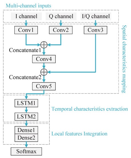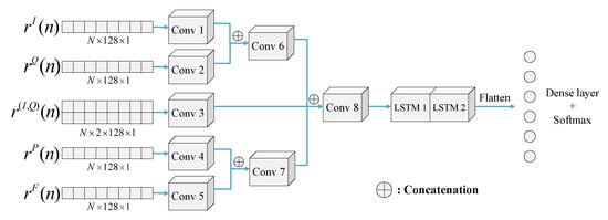 Communication signals contain both spatial characteristics and temporal correlations, so MCLDNN [39], which integrates CNNs, LSTMs and fully connected (FC) deep neural networks in a unified structure, can utilize their synergy for spatiotemporal feature extraction. Moreover, the imbalance between signal amplitude and phase deteriorates the orthogonality between the I channel and the Q channel and leads to an inherent difference between the two channels. So, the features extracted from the I-channel, the Q-channel and the I/Q-multi-channel data are complementary.