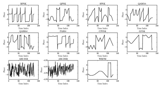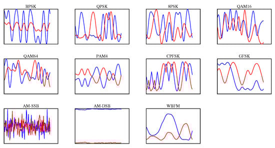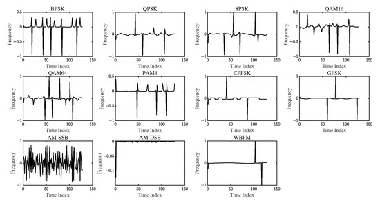 Figure 3, Figure 4, Figure 5 and Figure 6 display the waveform, instantaneous amplitude, instantaneous frequency and instantaneous phase of one sample of the 11 modulation types. In Figure 3, the blue curve represents the I-channel data, and the red curve represents the Q-channel data. It can be observed in the four figures that the I-channel data, Q-channel data and instantaneous parameters of the 11 modulated signals present large differences. Regarding instantaneous amplitude, BPSK, PAM4, CPFSK, GFSK, AM-SSB, AM-DSB and WBFM are different from each other. However, QPSK is similar to 8PSK, and 16QAM is similar to 64QAM. Regarding instantaneous frequency and phase, the 11 modulation types are different from each other. Therefore, the backbone neural network adds instantaneous frequency and phase as two new input channels on the basis of MCLDNN.