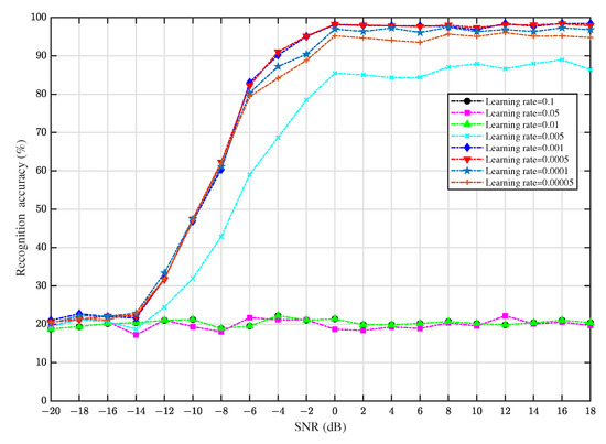 Many hyperparameters need to be tuned to generate a robust neural network that can accurately recognize modulation types. In addition, these hyperparameters can affect the performance of the network, along with its time to convergence. It is difficult to analyze the recognition performance of the neural network using the mathematical derivation, so this section will present the optimal hyperparameters determined with controlled groups of experiments. Specifically, we utilized five modulation types (BPSK, GFSK, AM-SSB, QAM16 and WBFM) in the RML2016.10a dataset as the experimental data to investigate the optimal selection of the network hyperparameters. In this paper, the selection of learning rate and batch size was considered.