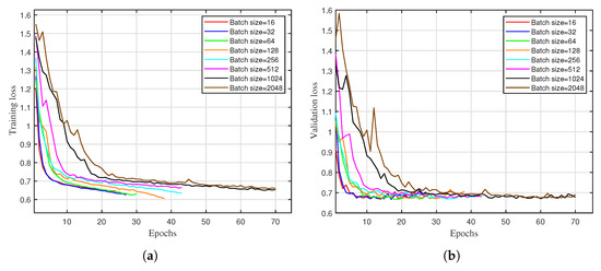In addition, the batch size, which is the number of samples used in every epoch to train the network, is also an important hyperparameter. To scale the stochastic gradient-based methods to more processors, it is necessary to increase the batch size to make full use of the computational power of each GPU. However, increasing the batch size often leads to significant loss in test accuracy. In this paper, the batch sizes were in the range of [16, 32, 64, 128, 256, 512, 1024, 2048]. The corresponding training time and training epochs are presented in Table 3. Figure 9 displays the training loss and validation loss of the network for different batch sizes.