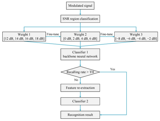 Most current modulation recognition techniques are based on likelihood ratio theory or feature extraction algorithms, which involve intricate steps and exacting conditions. A primary drawback of these approaches is that feature extraction and selection may result in the loss of some signal information. Consequently, neural network-based modulation recognition algorithms have garnered attention, as they can achieve end-to-end recognition without manual feature extraction. This class of algorithms can retain the signal information to the maximum extent and achieve better results. Neural network-based modulation recognition techniques for communication signals are more suitable for the emerging modulation types. However, the deep features extracted by neural networks cannot effectively recognize all modulation types, resulting in confusion among certain modulation types. The existing methods attempt to resolve this issue by increasing the number of network layers, such as implementing deep neural networks such as residual network 50 (ResNet50), to improve the modulation recognition rates. Nonetheless, when the dataset is large and the network has numerous parameters to learn, it takes a long time to train the network, thereby diminishing model efficiency. Furthermore, when the neural network is initialized with random weights and trained several times on the same dataset, the network recognition performance in each training process considerably varies. The modulation recognition rates of the same network trained with signals at high SNRs and low SNRs also exhibit significant disparities.