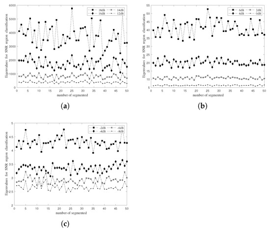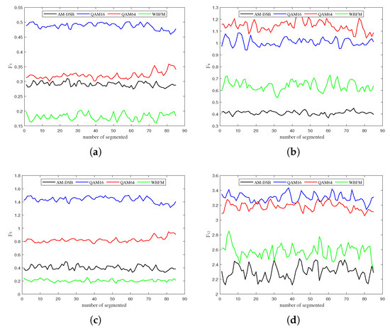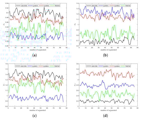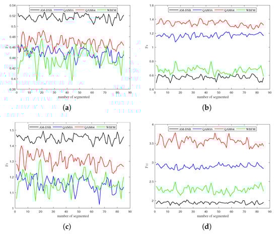 As shown in the three figures, in the high-SNR region of [12 dB, 18 dB], only , , and could distinguish among the four confused signals. In the medium-SNR region of [0 dB, 6 dB], could not distinguish among 16QAM, WBFM and 64QAM; could not distinguish between 16QAM and WBFM; and only and could better distinguish among the four confused signals. In the low-SNR region of [−8 dB, −2 dB], it can be seen in the distribution curves of , and that among the eigenvalue ranges of the four easily confused signals varying degrees of overlap existed. Only could distinguish among the four confused signals.