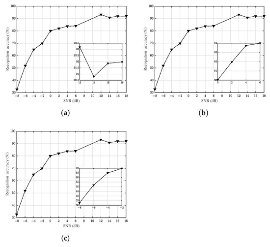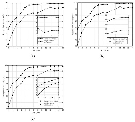 Recognition accuracy comparison before and after feature re-extraction by the network with randomly initialized weights in the three SNR regions: (a) [12 dB, 18 dB], (b) [0 dB, 6 dB] and (c) [−8 dB, −2 dB].