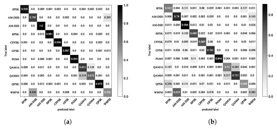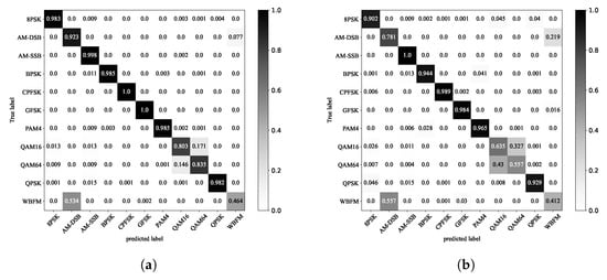 Figure 20 shows the confusion matrices of the 11 modulated signals after feature re-extraction in the high-SNR region of [12 dB, 18 dB]. Seven modulation types could be fully identified by the backbone neural network, and the other four confused modulation types, AM-DSB and WBFM, and 16QAM and 64QAM, could be well distinguished using feature re-extraction; thus, the effectiveness of the feature re-extraction method in confused signal recognition was further demonstrated.