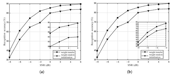 In Figure 19, for the signals in [12 dB, 18 dB], the modulation recognition accuracy of the network with randomly initialized weights was 91.96%, while the accuracy based on feature re-extraction was 98.66%, which is an improvement of about 7%. In [0 dB, 6 dB], the modulation recognition accuracy of the network with randomly initialized weights was 82.44%. The accuracy based on feature re-extraction was 95.95%, which is an improvement of about 14%. In [−8 dB, −2 dB], the modulation recognition accuracy of the network with randomly initialized weights was 54.82%, while the accuracy based on feature re-extraction was 71.68%, which is an improvement of about 17%. The experimental results reveal that the feature re-extraction method can greatly improve the modulation recognition performance.