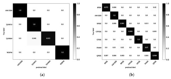 Confusion matrix of (a) the four confused modulation types and (b) the seven non-confused modulation types.