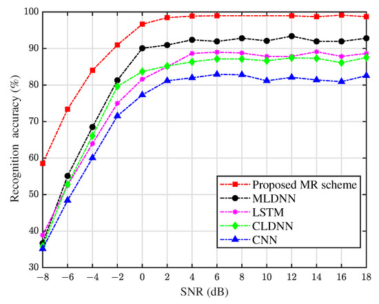 It can be observed in Figure 22 that CNN-IQ had relatively low classification accuracy. Its average recognition rate was 73.53% at SNRs ranging from −8 dB to 18 dB, and the maximum accuracy was 82.91% at SNR = 6 dB, which shows that CNN is relatively low-performing in the feature extraction of time-series signals. LSTM-IQ had better recognition results than CNN-IQ, but it has high computational requirements and requires a long training time to obtain good results. The CLDNN-IQ model had higher recognition accuracy than LSTM-IQ and CNN-IQ at low SNRs. The average accuracy of CLDNN-IQ was 78.49% at SNRs ranging from −8 dB to 18 dB, and the maximum accuracy was 87.44% at 12 dB. MCLDNN-IQ had better performance than CLDNN-IQ when SNR ≥ −6 dB. Its maximum recognition accuracy was 93.38% at SNR = 12 dB, and the average accuracy was 82.99% at SNRs ranging from −8 dB to 18 dB. Regarding the optimization scheme proposed in this paper, its recognition accuracy reached 58.53% at SNR = −8 dB and 96.65% at SNR = 0 dB. The average accuracy was 91.28% at SNRs ranging from −8 dB to 18 dB, which is an improvement of 8% to 17% compared with that of the other four existing schemes. The simulation results prove that the proposed scheme is an advanced method in terms of recognition accuracy.