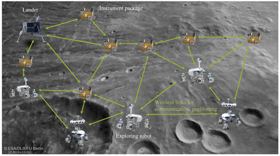 Autonomous robotic swarms are envisioned for a large variety of applications on Earth and in space. On Earth, they can be used for search and rescue missions, disaster management after natural or industrial disasters, and environmental monitoring [1,2]. In space, we envision robotic swarms and scientific instruments deployed on the lunar or Martian surface for exploration; see Figure 1 [3,4,5,6]. An important feature of a robotic swarm is its ability to share information about its sensed environment, its current state, and the robustness to failure of swarm elements [7,8]. For example, a robotic swarm can sense spatio-temporal processes such as gas distributions in a distributed fashion [9]. Every exploration of a physical phenomenon requires position information, timing information, and communication. Infrastructure is commonly not available for, e.g., lunar exploration; see Figure 1. GNSS (global navigation satellite system)-based positioning, and satellite or cellular communications are not available. However, we can see the robotic swarm and all sensors deployed as instrument packages in Figure 1 as one cooperative network [10]. Wireless communication is established by exchanging radio signals. These radio signals can then be used for ranging: a distance estimate among all entities is obtained by estimating the ToF (time of flight) or RTT (round trip time) of the radio signal [11,12]. Ranging estimates are subsequently used to estimate the position of each swarm-element. We distinguish two positioning techniques, namely non-cooperative and cooperative positioning [12,13]. In non-cooperative positioning, ranging estimates between a swarm-element and so called anchors are used. Anchors are entities with known position, for example, the lander and two instrument packages closely deployed to the lander; see Figure 1. In practice, not all swarm-elements have connectivity to the anchors due to path loss or shadowing caused by the terrain. Cooperation is the solution, where swarm-elements obtain ranging estimates. The position of each swarm-element can then be estimated cooperatively in a centralized or decentralized fashion [13,14].