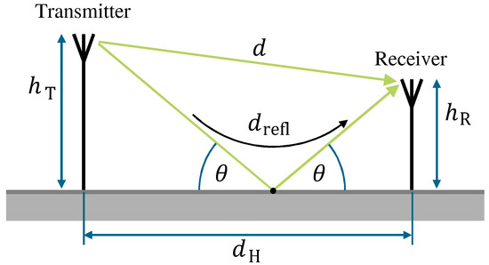 The two-ray ground reflection channel is commonly used to model large-scale fading in various wireless communication applications [21,22]. Figure 2 shows the geometry. Transmitter and receiver are at height and , respectively, and separated by the horizontal distance . The first ray is the LoS component with its distance denoted as d, with if . The second ray is the component reflected from the ground with its equivalent distance . Based on this geometry, the two signal components observed by the receiver are