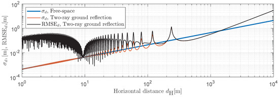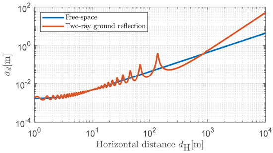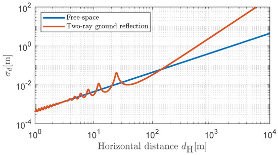 Let us have a look at the first results, and for a more intuitive assessment, we depict the ranging standard deviation . Figure 4 shows the ranging standard deviation over a horizontal distance from 1 to 10 for a transmitter and receiver height of m. This low antenna height is representative of micro-rovers or instrument packages. We apply (15) with system parameters from Table 1. The noise variance is determined based on the receiver SNR for the free-space path loss and the two-ray ground reflection case, respectively. We clearly see the linear increase in in the log–log domain for the free-space path loss case. The radio signal component reflected from the ground results in a -dependent received signal power variation, and thus, a variation of SNR and . The red curve in Figure 4 shows this clearly. At a of about 150 , we observe that the steepness of is a factor of two in the log–log domain compared to one for the free-space path loss case. This transition point is commonly called the breakpoint distance.