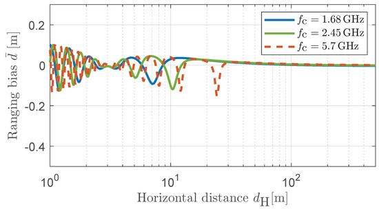 Besides the ranging variance, determined by the SNR, we are also interested in the ranging bias, denoted as . The radio channel defined in (10) consists of two signal components, yet the estimator in (12) assumes a single signal component only. Propagation delay differences between the LoS component and the ground-reflected component become very small with increasing , and thus are only a very small fraction of the sample length. The used signal bandwidth from Table 1 relates to a sample length of . We therefore expect that a -dependent ranging bias as the second signal component cannot be resolved by the estimator, and have a closer look at some results. The investigation of the ranging bias in this work is closely related to, e.g., the MEE (multipath error envelope) determination in GNSS signal design. The main difference is that the relative signal component amplitudes, phases, and delays are determined by (1) and (2). We determine the ranging bias by applying (12) without additive white Gaussian distributed noise.