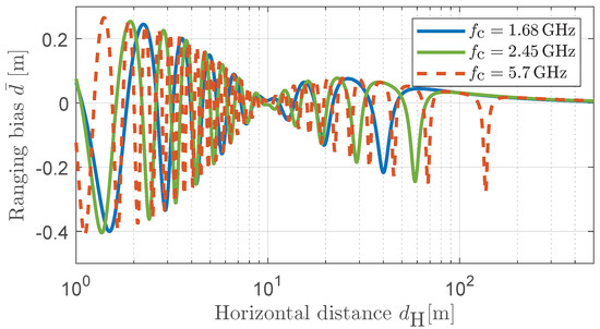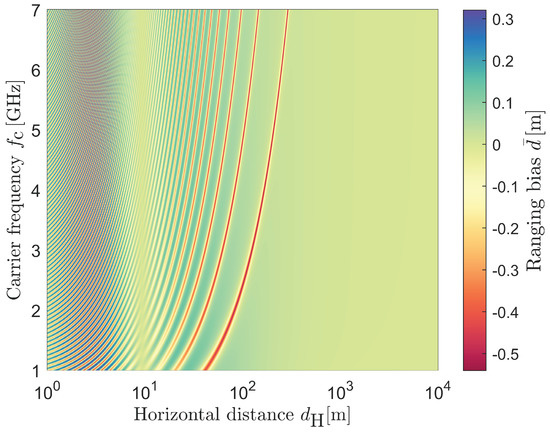 To obtain a better understanding of the influence of the carrier frequency on the ranging bias variations, we determine for carrier frequencies from 1 to 7 . Figure 8 shows the result for a transmitter and receiver antenna height of m each. We will use these height values in the remainder of the paper to represent a setup such as a robot with an antenna pole. Our results provide insight how, e.g., the ranging bias will change at a specific horizontal distance if one selects a different carrier frequency for ranging.