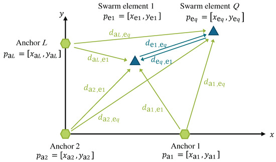 Positioning of two swarm elements based on distance observations. Anchors have known position, and ranging links among swarm elements are used for cooperative positioning.