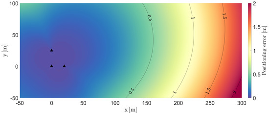 Positioning error of a single swarm element based on the CRB with free-space path loss model. Black triangles show the anchor node positions and contour lines are plotted for every .