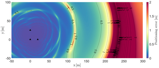 Positioning error of a single swarm element based on ML estimation with the ranging bias and ranging variance determined by the two-ray ground reflection model. Black triangles show the anchor node positions and contour lines are plotted every . For visual clarity, we removed contour labels and the color-coding is saturated at 2 .