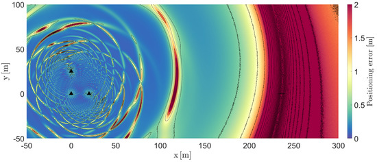 Positioning error of a single swarm element based on the CRB with two-ray ground reflection model. Black triangles show the anchor node positions, and contour lines are plotted for every . The positioning error significantly increases and shows rapid spatial variations. The color coding is saturated at 2 , and errors of up to 13 are reached.