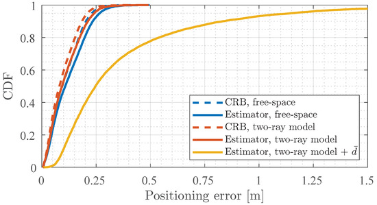 The orange curve in Figure 14 shows the result of the estimator with the ranging bias, and the ranging variance determined by the two-ray ground reflection model. The positioning error is significantly increased: from 18 to 83 for the percentile.