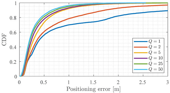 CDF of the positioning error for an increasing number of Q swarm-elements. As expected, we see an improvement for increasing Q, but it becomes small beyond five swarm-elements.