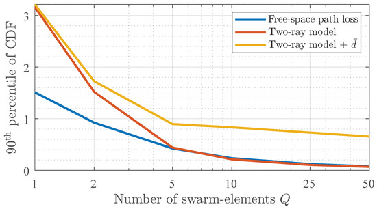 90th percentile of the positioning error over the number of swarm elements Q. An increasing number of Q results in a lower positioning error in general. However, for the two-ray ground reflection model with ranging bias , the error decrease becomes small for .