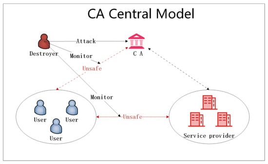 For the model in Figure 1, all system business will flow to the authentication center for data filtering and storage. First, we should consider the performance issue with CA. With the continuous growth in the number of users, the lightweight central service may not be able to support simultaneous multi-user access. In addition, when attackers attempt to block and destroy CA using worm attacks and other methods, it may cause the entire system to be paralyzed. Secondly, CA has the highest authority in the system, and all user data will flow into the central organization for review and storage. If CA is tempted by other larger interests and causes corruption, all information will be directly disclosed, leading to privacy leaks.