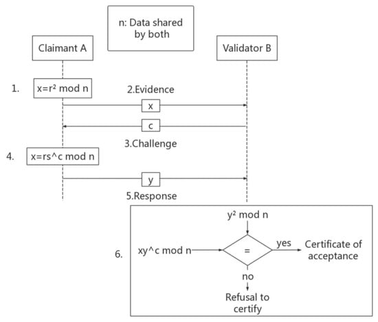 Zero-knowledge proofs were proposed by S. Goldwasser, S. Micali, and C. Rackoff in the early 1980s. This proof method allows the prover to prove to the verifier that it possesses a particular piece of information without revealing its secret information. In communication between a communicating entity B (the prover) and A (the verifier), if B is able to successfully prove to A that it possesses the secret but A is unable to infer the secret information, the proof is shown to have zero knowledge. In addition, a zero-knowledge proof needs to satisfy correctness, i.e., the inability of A to master a proof method that makes it highly probable that B possesses the secret. Finally, a zero-knowledge proof also needs to satisfy completeness, i.e., B possesses a theorem-proving method that makes A believe that B can complete the proof. Next, we give specific definitions in Algorithms 2 and 3, and describe the proof process in detail. The flow of the scheme is shown in Figure 3.