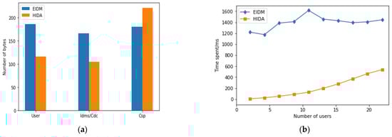 The authentication time of the designed HIDA scheme for different numbers of users was calculated using a Shell script. The authentication for each user count was statistically measured ten times, and the longest and shortest times were excluded before calculating the average. The results are shown in Figure 7. It can be observed from the results that the HIDA scheme performs significantly faster than the EIDM scheme for different numbers of users.