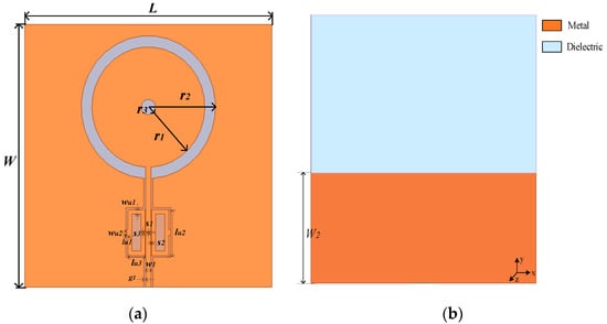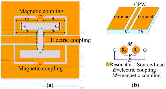The CPW filtering antenna is constructed with a coplanar waveguide bandpass filter and a double-sided circular radiator, as shown in Figure 1, where Figure 1a,b are the front view and the backside view of the filtering antenna, respectively. There is no transition structure between the filter and the radiator, which eliminates transition loss []. The CPW BPF consists of double capacitive coupled feeding lines and a second-order rectangular split ring uniform impedance resonator with separated electric and magnetic coupling paths [], as shown in Figure 2, where Figure 2a is the filter topology and Figure 2b is the CPW structure and coupling structure. CPW has the advantages of easy shunt and series with the other components, and via holes are not required because the conductor strip and the ground are coplanar. On the other hand, CPW can be applied in a millimeter-wave frequency band. The ground shunt introduces magnetic coupling (M-coupling), while the rectangular split ring and the source load bring electric coupling (E-coupling). The M-dominant and the E-dominant coupling paths bring two transmission zeros. The circuit is designed on Rogers substrate, which has a relative dielectric constant of 2.2 and dielectric height of 0.508 mm.