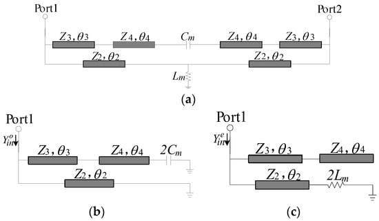Figure 3a shows the equivalent transmission line (TL) circuit of the rectangular split ring uniform impedance resonator (UIR) with separation electric and magnetic coupling. Lc and Cc denote the coupling-inductance and coupling-capacitance of the split ring CPW UIR, respectively; Z1 is the impedance of the CPW uniform impedance resonator with a width of wu1. The corresponding electric length is shown in Figure 2. The equivalent circuit of the odd mode is provided in Figure 3b, and that of the even mode is provided in Figure 3c, where Z2 = Z3 = Z4 = Z1.