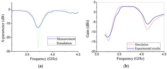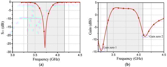 Simulation filtering antenna frequency responses for the dimensions provided above are shown in Figure 4. Figure 4a shows that the filtering antenna works at 3.7 GHz and the S11 attenuation is no more than 26 dB. Figure 4b shows that the filtering antenna has gain of more than 2.5 dBi, from 3.5 GHz to 3.84 GHz, and dual gain zeros are realized at 3.25 GHz and 4.12 GHz. The gain zeros are due to the filter transmission zeros, which are produced by the 2-order split ring UIR with SEMC.