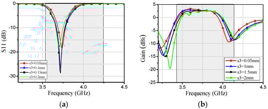 The effects of electric coupling on S-parameter and gain are shown in Figure 5a and b, respectively. As s3 increases gradually, the attenuation of S11 first decreases and then increases, and when s3 = 0.1 mm, the antenna achieves favorable return loss and impedance matching, as shown in Figure 5a. As for gain versus s3, when s3 changes from 0.05 mm to 2 mm, the attenuation of the gain zero on the left side increases, thus enhancing the out-of-band suppression level. However, the attenuation of the right gain zero decreases with increasing s3, leading to a lowering of the out-of-band suppression level. Additionally, the gain in the passband is significantly reduced when s3 equals 1.5 mm or 2 mm, and the filtering antenna has a better gain when s3 = 1 mm.
